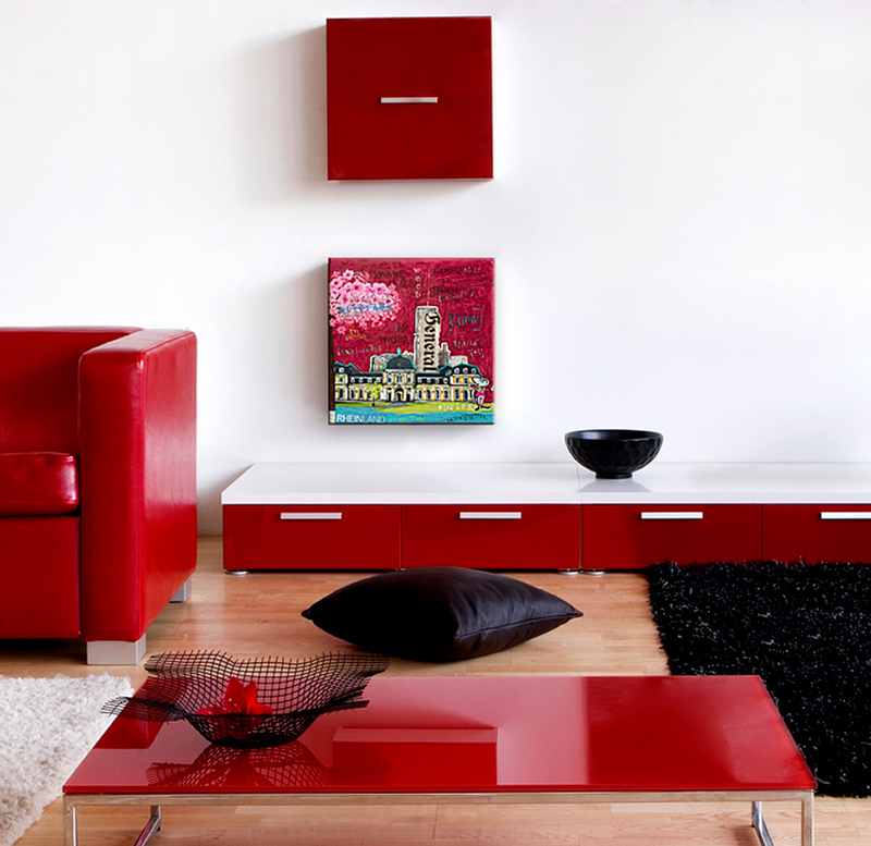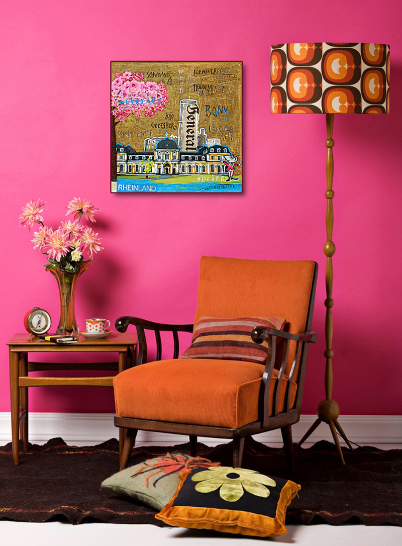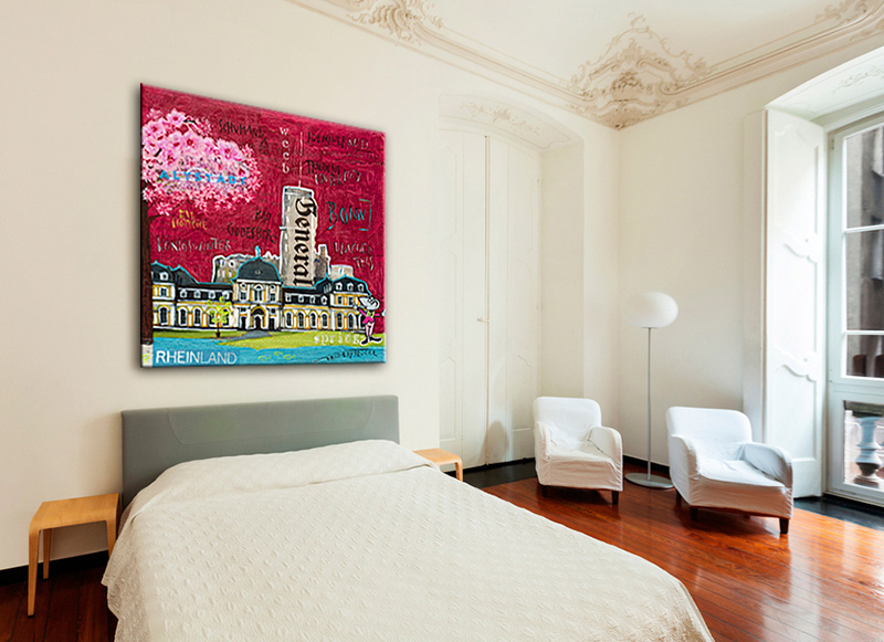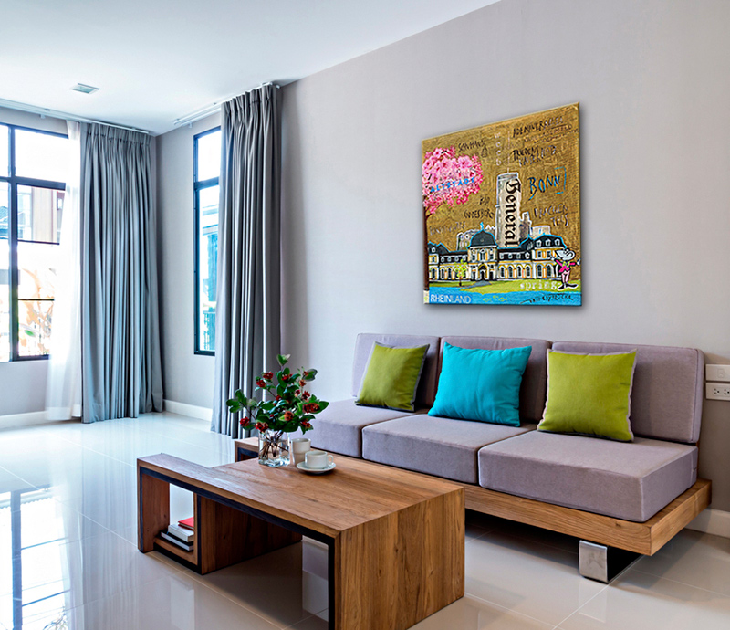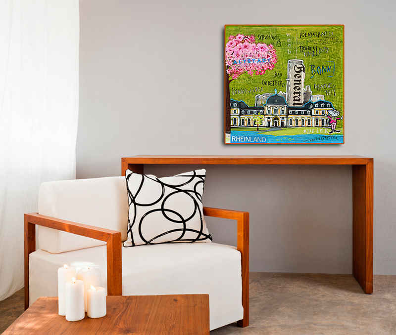 kann ohne zusätzlichen Rahmen direkt aufgehangen werden. Ab dem Format 50x50 sichere Aufhängung durch stabile Bilderhaken (fertig am Keilrahmen montiert). Keilrahmentiefe: 2cm bis Format 40x40, 3cm ab Format 50x50.