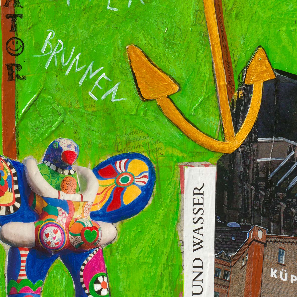 Trotz der rauen, industriellen Kulisse hat Duisburg auch seine grünen Seiten, welches mit dem intensiven grünen Hintergrund der Collage dargestellt ist.
