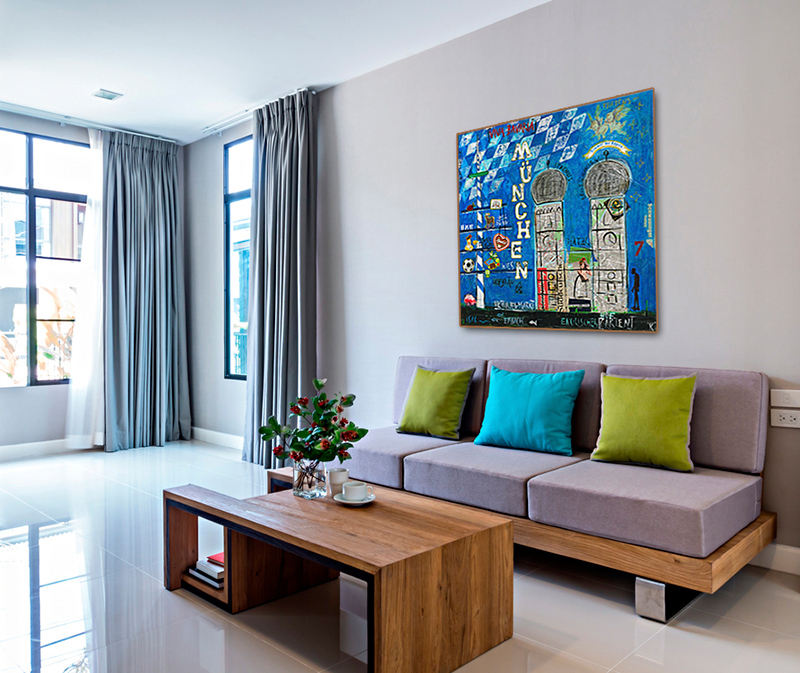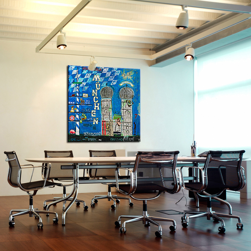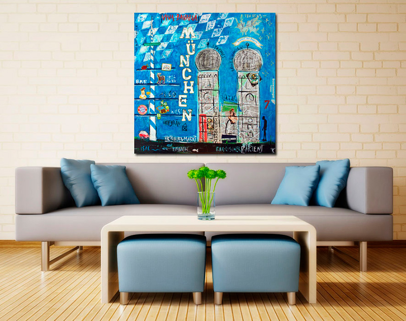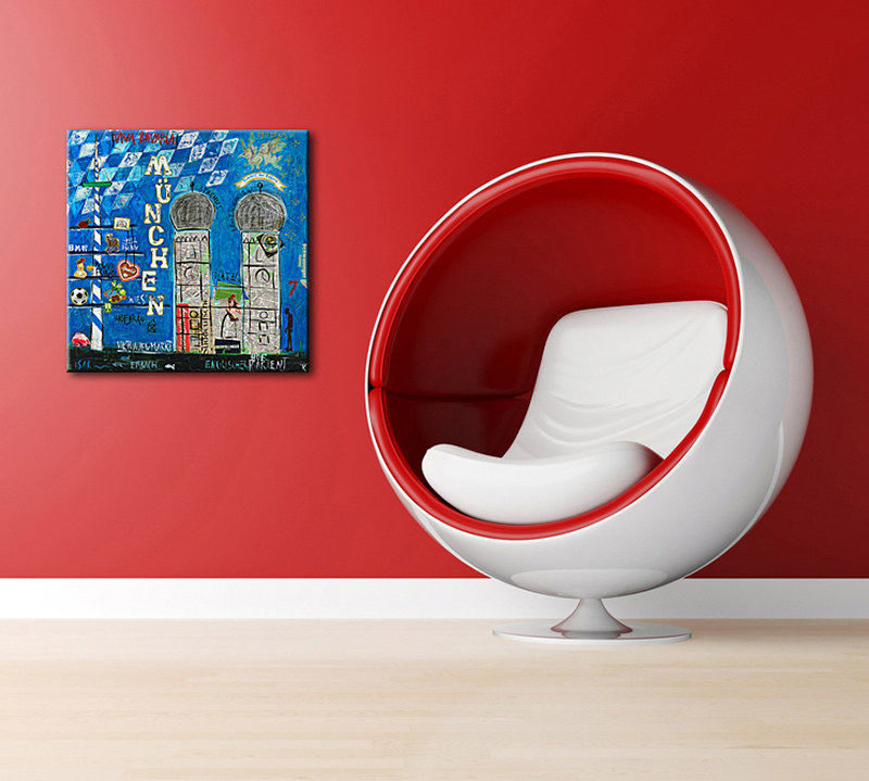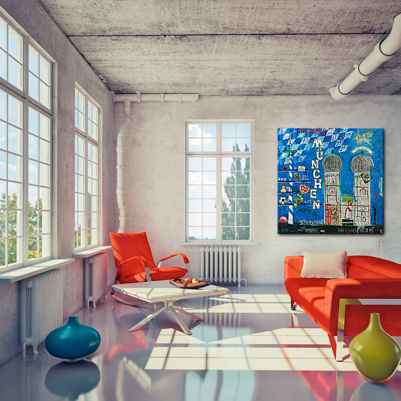 Das Leinwandbild München kann ohne zusätzlichen Rahmen direkt aufgehangen werden – es ist auf einem nahezu verzugsfreien Galerie-Holzkeilrahmen gespannt und rückseitig geklammert.