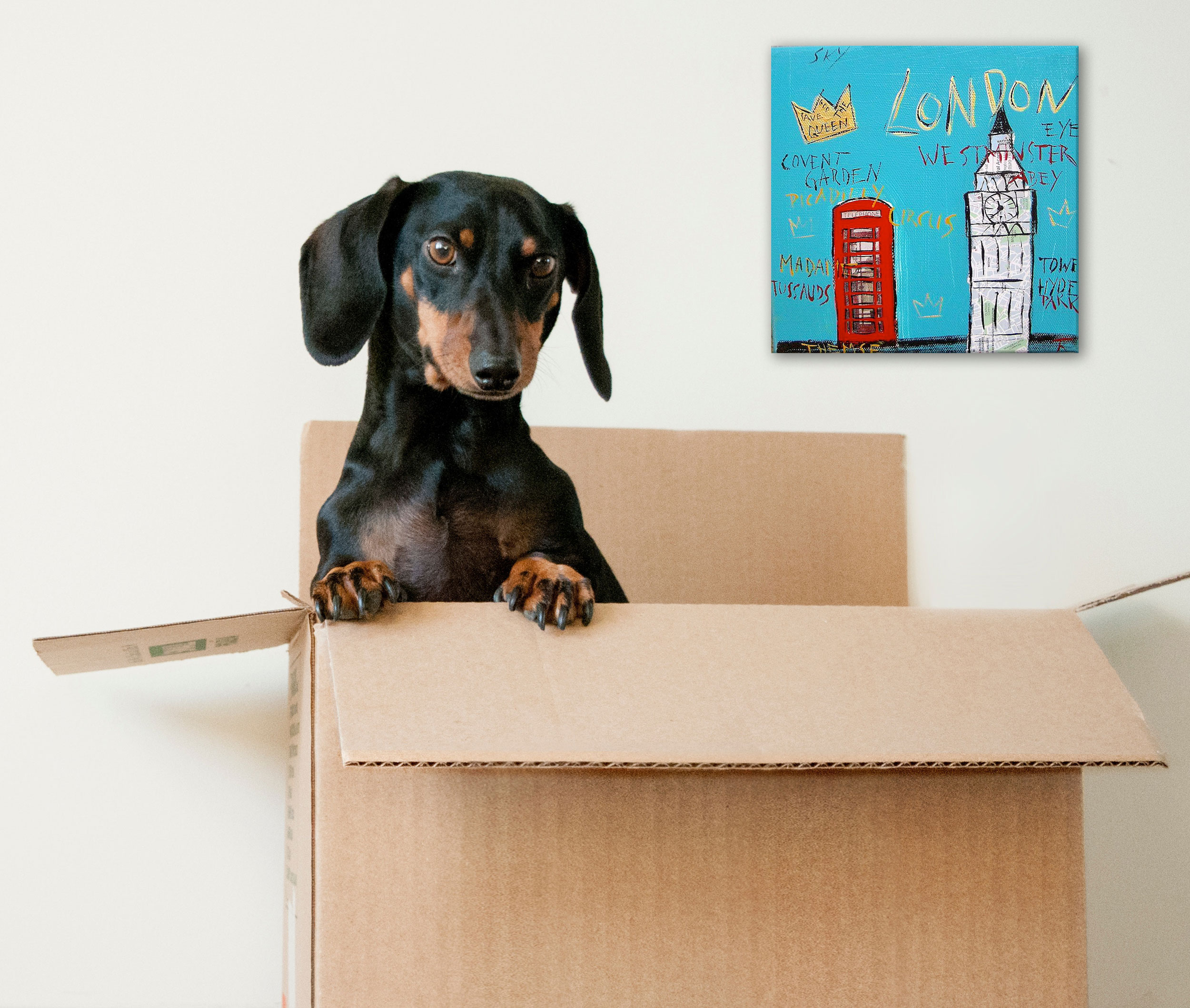 Orte und Begriffe wie Covent Garden, Piccadilly Circus, Westminster, Hyde Park, Madame Tussauds und St James’s verankern das Motiv in London und geben ihm eine persönliche, skizzenhafte Note. Kleine ikonische Details ergänzen die Szene und machen das Bild trotz des kleinen Formats spannend – ideal als Akzentbild oder als Teil einer Galeriewand.